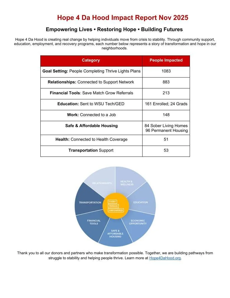 At Hope 4 Da Hood, every donation is a seed of change, sown into the heart of Wichita's urban communities. Your contribution goes beyond mere financial support; it ignites hope, fosters resilience, and paves pathways to empowerment for individuals and families striving to overcome the challenges of poverty, crime, and inequality. By donating, you become an integral part of a transformative journey, where former gang members, addicts, felons, and at-risk individuals find new purpose. Your generosity not only supports our impactful programs, but provides Hope 4 Da Hood. Together, let's build a legacy of transformation that endures for generations.